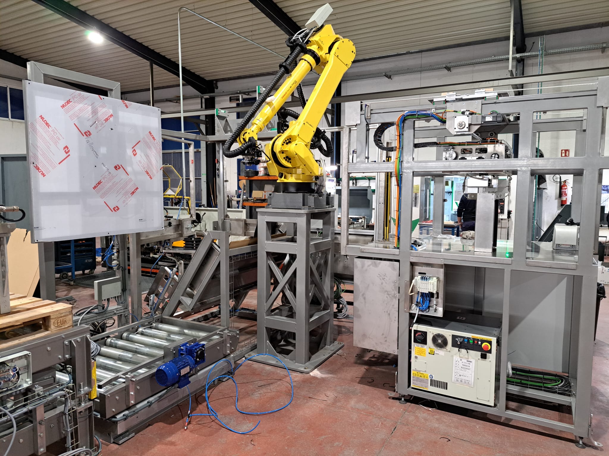 El conjunto consta de un robot con intercambiador rápido de herramientas , manipulador de producto para llevarlo hasta zona de robot , dosificado de cartón y palets. Toda la linea está automatizada