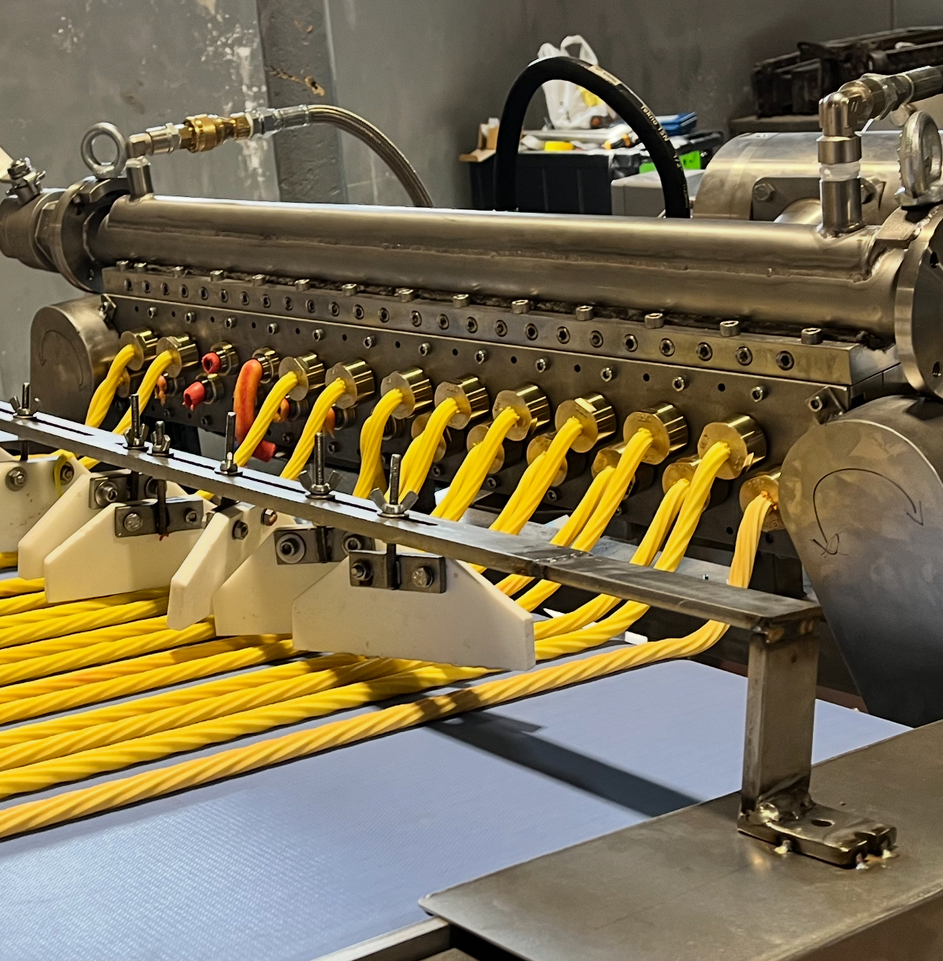 El modelo de doble husillo está construido con un sistema modular. Las extrusoras se pueden combinar para dar pasta de azúcar rellena de regaliz, regaliz rellena de pasta de azúcar o pasta de azúcar de dos colores. Disponen de sistema intercambiador de filtros dobles previo a la entrada de la bomba de engranes.